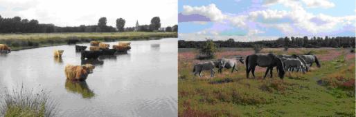 Schottische Hochlandrinder im Wacholderhain mit Wildpferde(Tarpan) im Wacholderhain